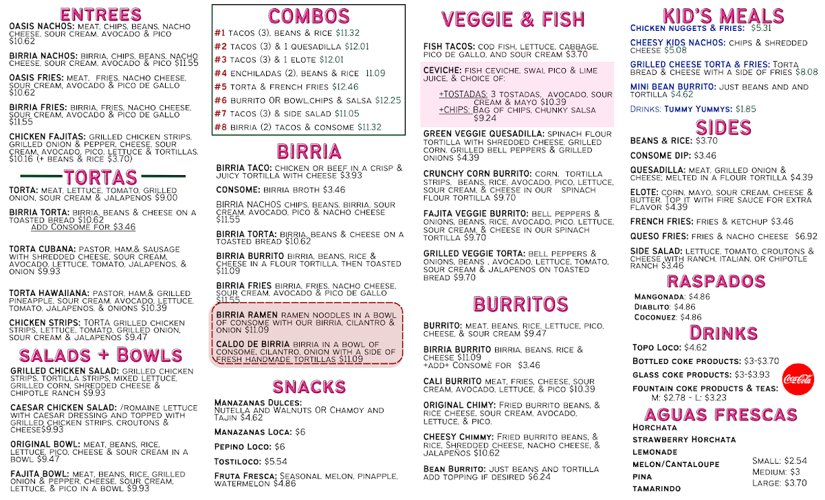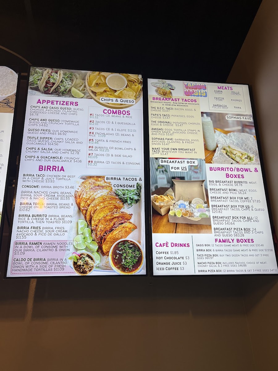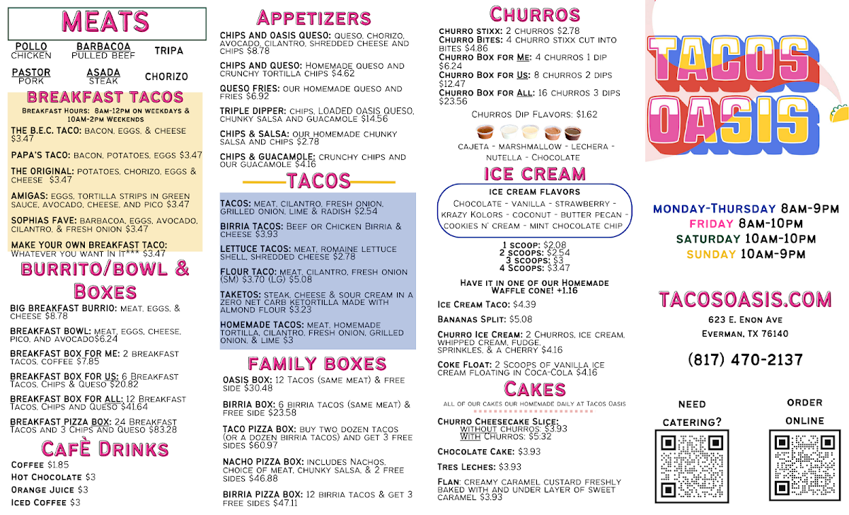 Tacos Oasis, located in Everman, TX, is a cherished culinary hotspot known for its vibrant and welcoming atmosphere. This hidden gem delights patrons with a diverse menu featuring standout dishes like flavorful Birria tacos and irresistible elotes. With both indoor and outdoor seating, families can enjoy a laidback dining experience, complemented by a playful environment for kids. Customers rave about the excellent service and fair pricing, making Tacos Oasis a perfect gathering spot for any occasion. Whether you're indulging in a gourmet dessert or savoring a refreshing limonada, this oasis promises delicious food and memorable experiences for all.